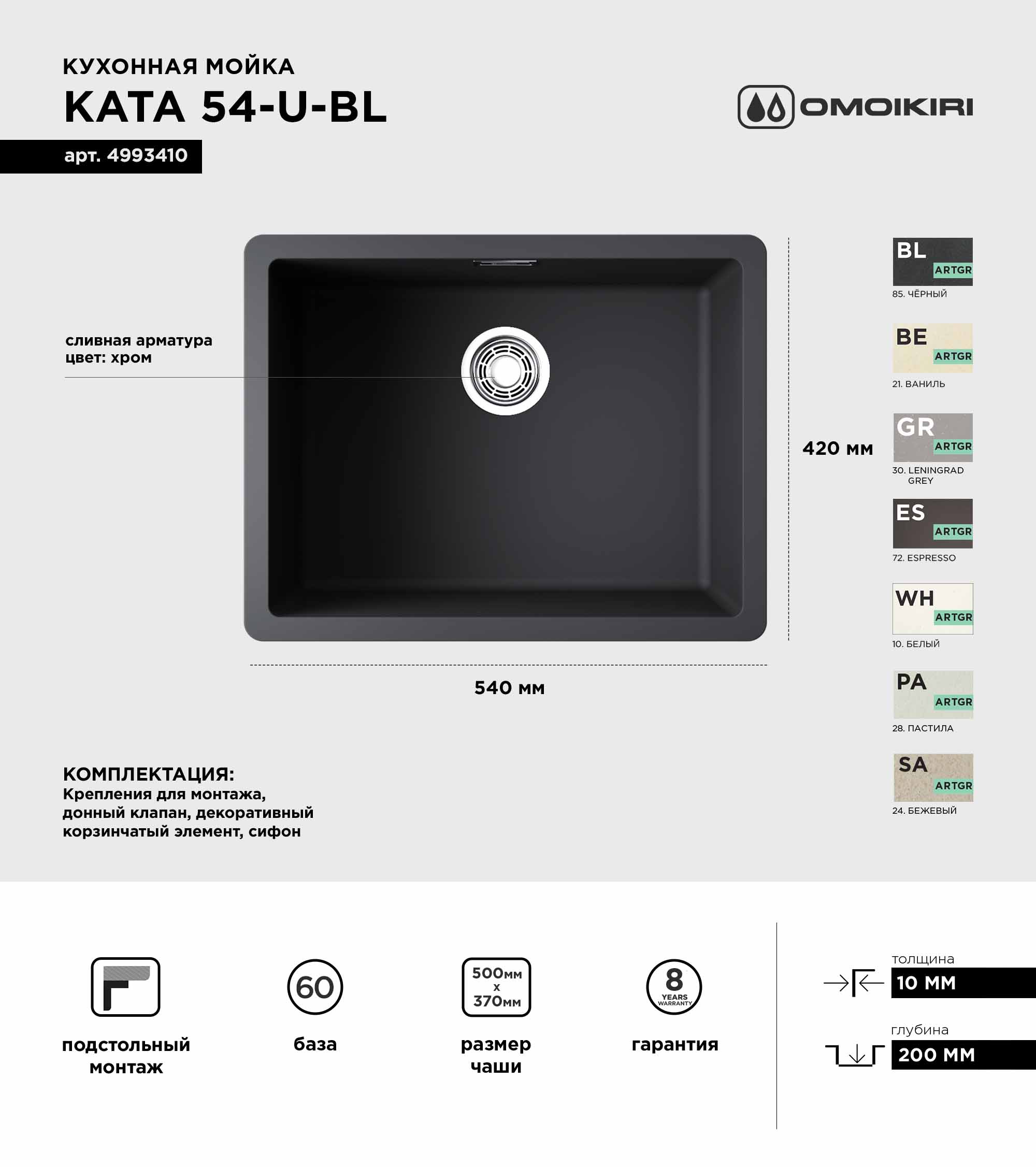 Купить Мойка кухонная Omoikiri Kata 54-U-BL черная вы можете в компании Вся сантехника, оформив заказ в интернет магазине, или