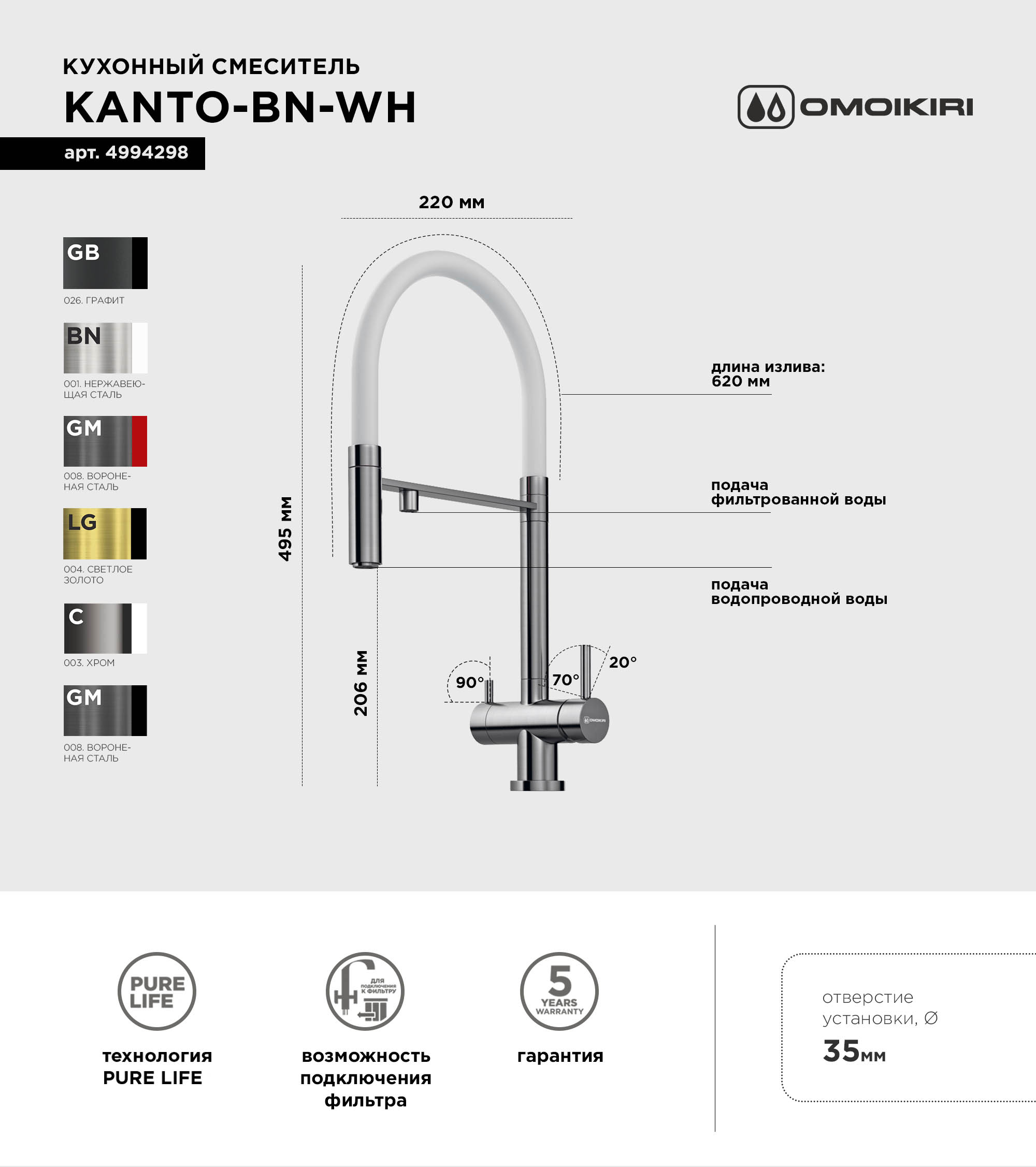 Купить Смеситель для кухни Omoikiri Kanto BN-WH с гибким изливом вы можете в компании Вся сантехника, оформив заказ в интернет магазине, или